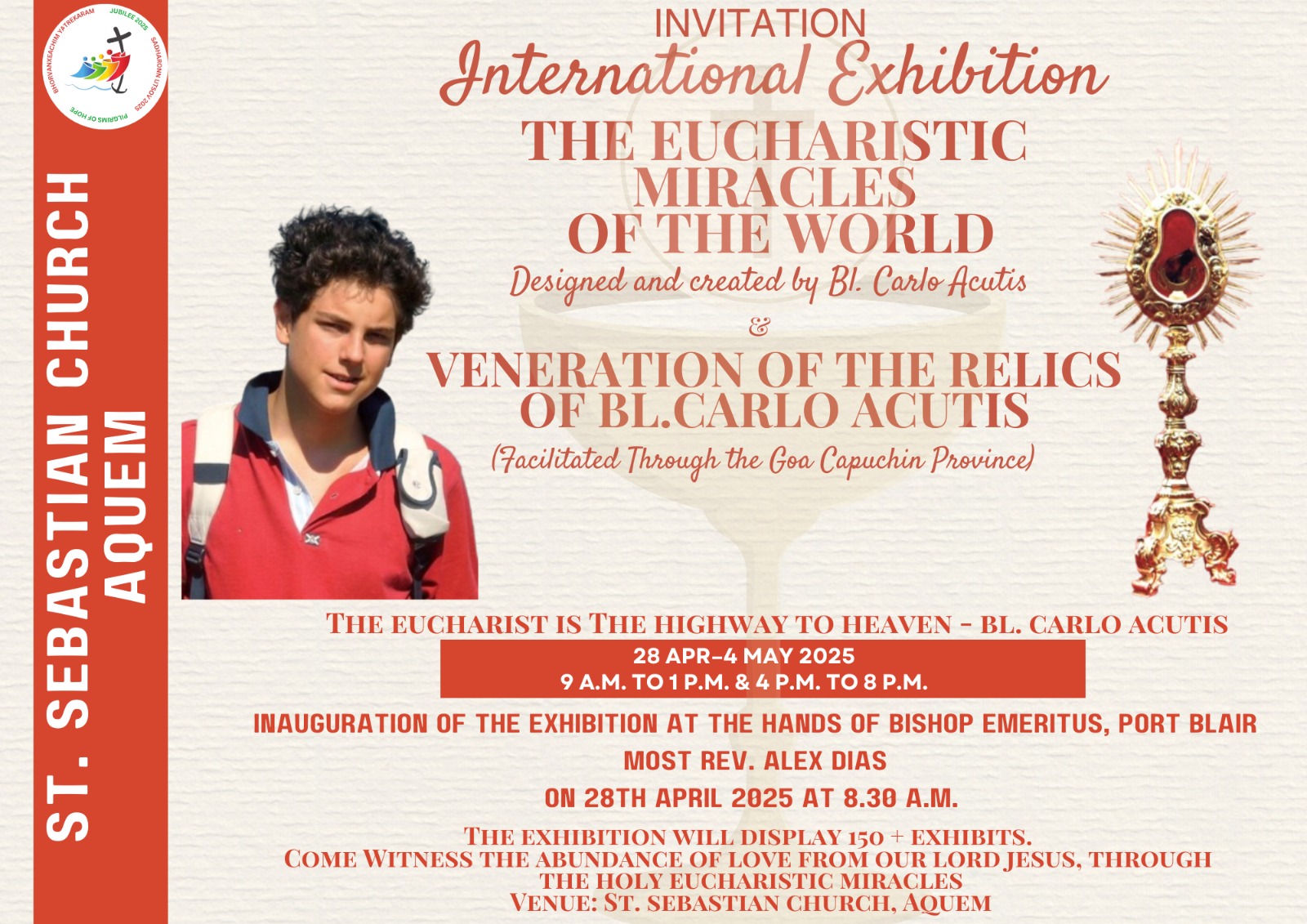 Goa, 27 April, 2025- St. Sebastian Parish, Aquem-Margao, will host the International Exhibition on the Eucharistic Miracles of the World, along with the veneration of the relic of Blessed Carlo Acutis, from 28th April to 4th May 2025. The exhibition will run daily in two sessions: 9:00 a.m. to 1:00 p.m. and 4:00 p.m. to 8:00 p.m.