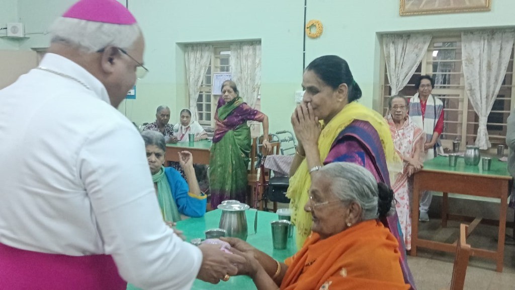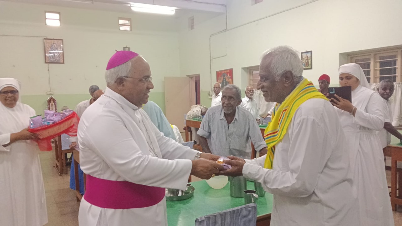 Following the Mass, Bishop Serrao visited each elderly resident personally. He interacted with them affectionately, enquired about their well-being, and offered individual blessings. He also presented a small token of love, bringing visible comfort and joy to the residents.