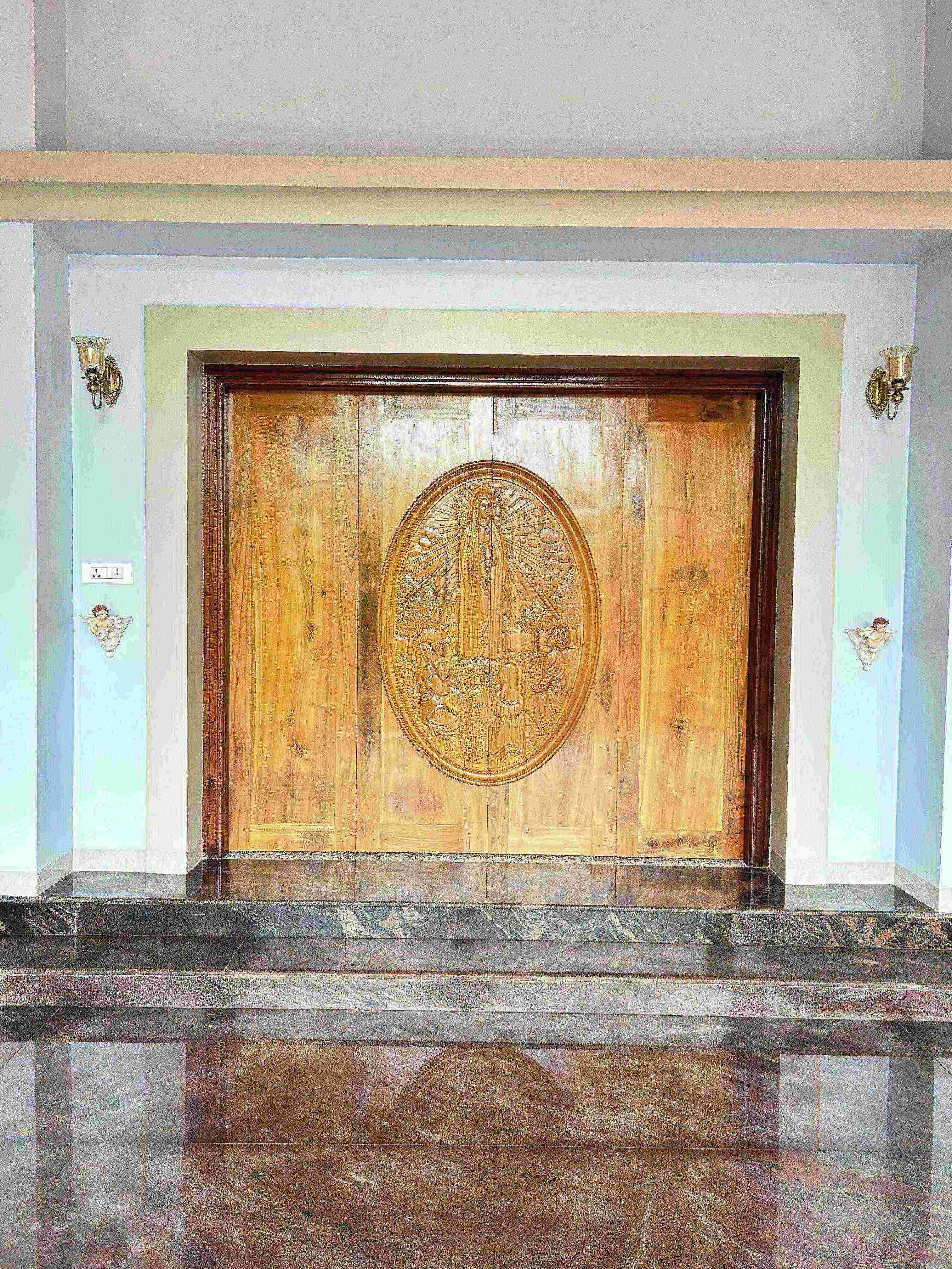 The renovated Chapel features wooden doors adorned with religious engravings: the central door bears the image of Our Lady of Fatima, Patroness of the Chapel, while the side doors depict St. Joseph Vaz, Patron of the Archdiocese, and St. Thérèse of the Child Jesus, the Carmelite saint whose canonization centenary is being observed this year.