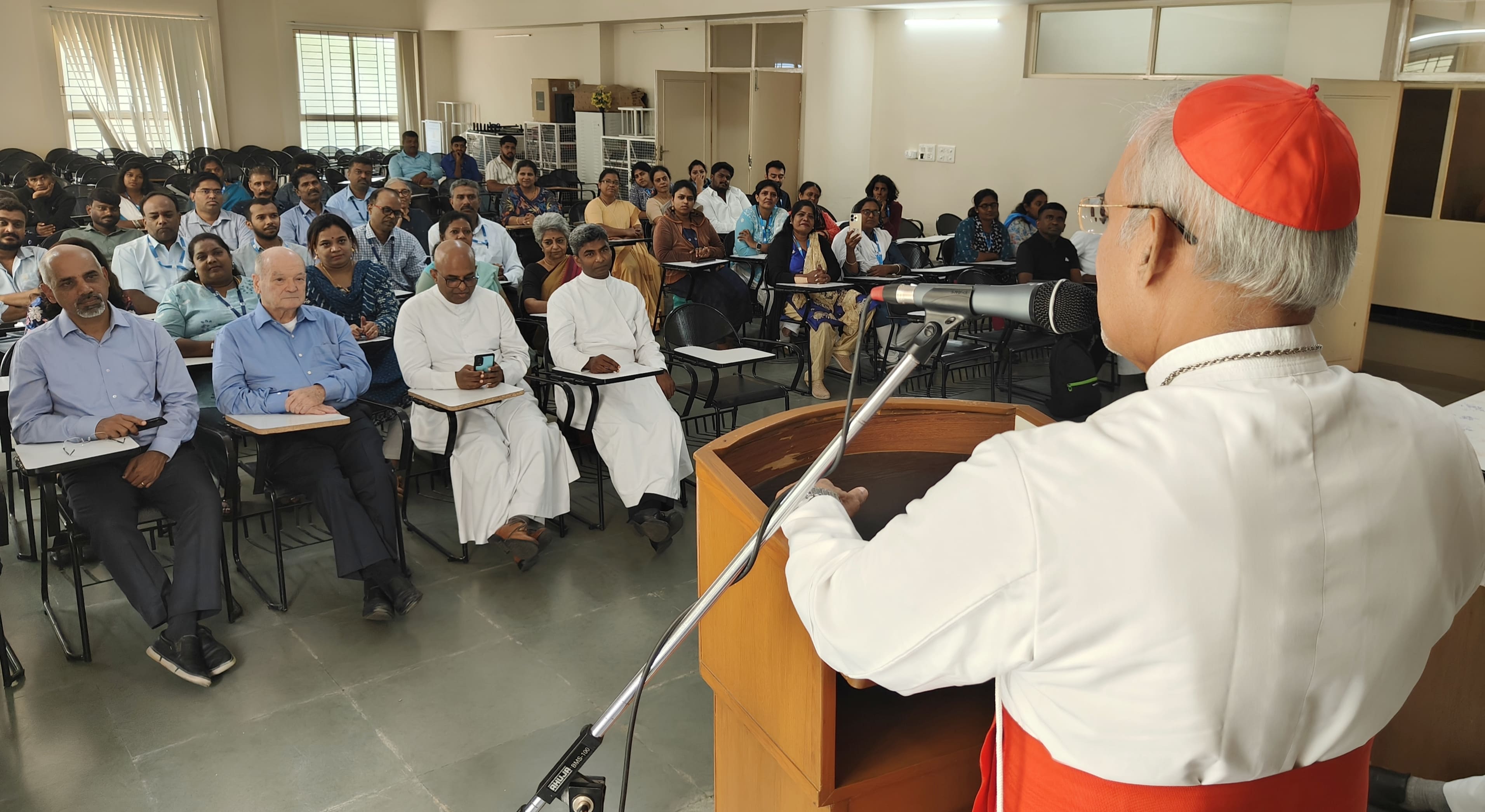 Prior to the programme, Cardinal Filipe Neri Ferrão celebrated the Holy Mass with the staff members. Following the Mass, he met with the staff, where Archbishop Peter Machado of Bangalore delivered a benedictory message. Archbishop Machado praised the remarkable growth of the CCBI in recent years, particularly highlighting new initiatives, such as the Catholic Connect app and Arclight Global.