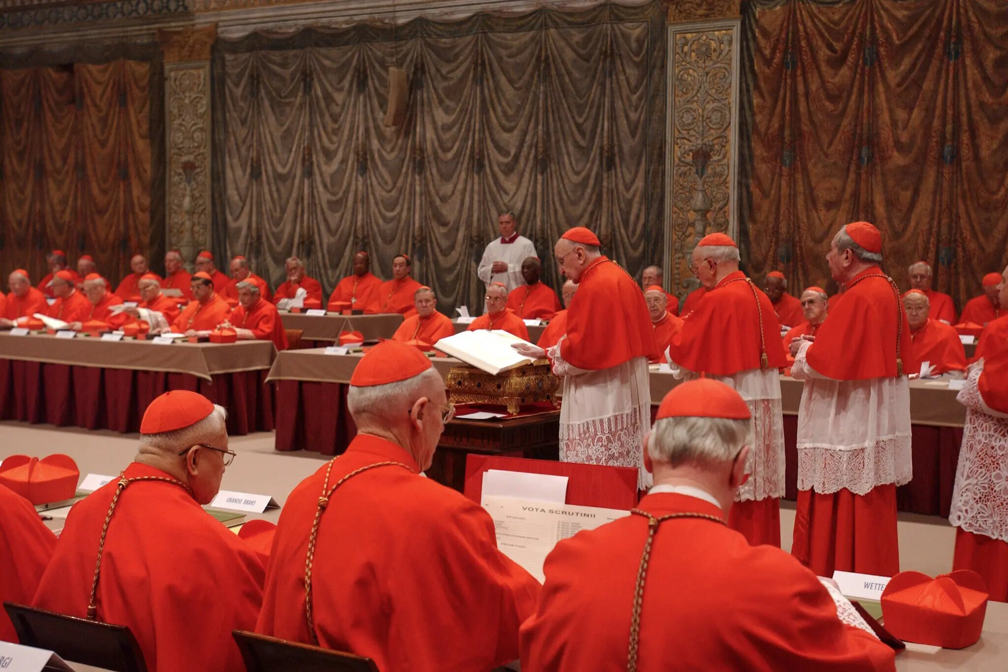 Each cardinal then individually approaches the Holy Scriptures, places his hand upon them, and declares: "Et ego, [Name], promitto, voveo ac iuro. Sic me Deus adiuvet et haec Sancta Dei Evangelia, quae manu mea tango." (“And I, [Name], do so promise, vow, and swear. So help me God and these Holy Gospels which I touch with my hand.”)