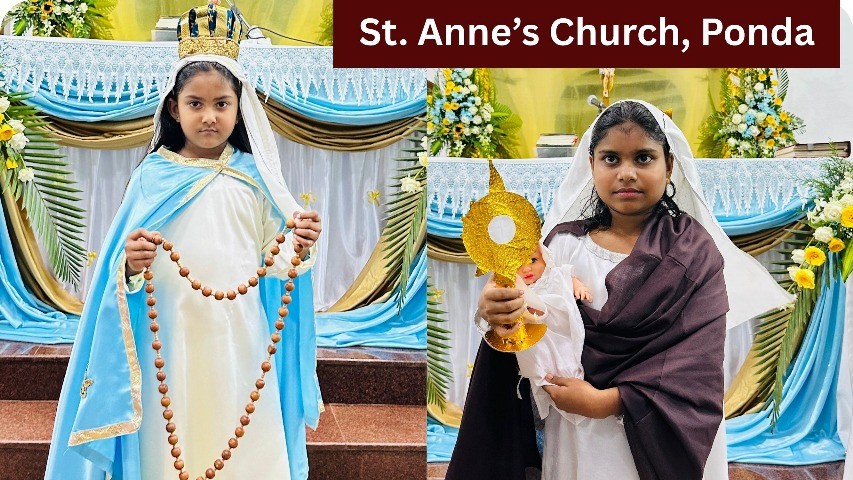 At St. Anne’s Church in Ponda, the celebrations featured flower offerings, a meditative rosary, and the celebration of a solemn Holy Mass. After the Mass, a Marian procession was held. The solemn procession was led by 21 children, each representing a title of Our Lady. The church was adorned in blue and white décor and lanterns. A joyful cake-cutting ceremony made the celebration memorable.