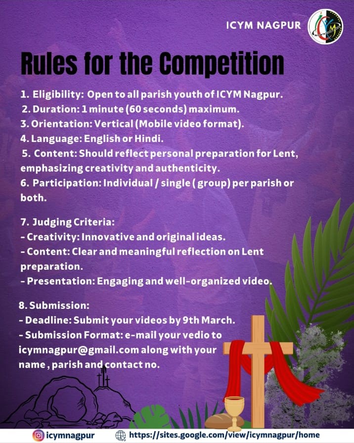 The contest is open to all parish youth under ICYM Nagpur. Participants are required to create a one-minute video in English or Hindi in a vertical mobile format, showcasing their personal and creative approach to Lent.