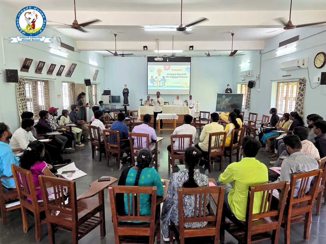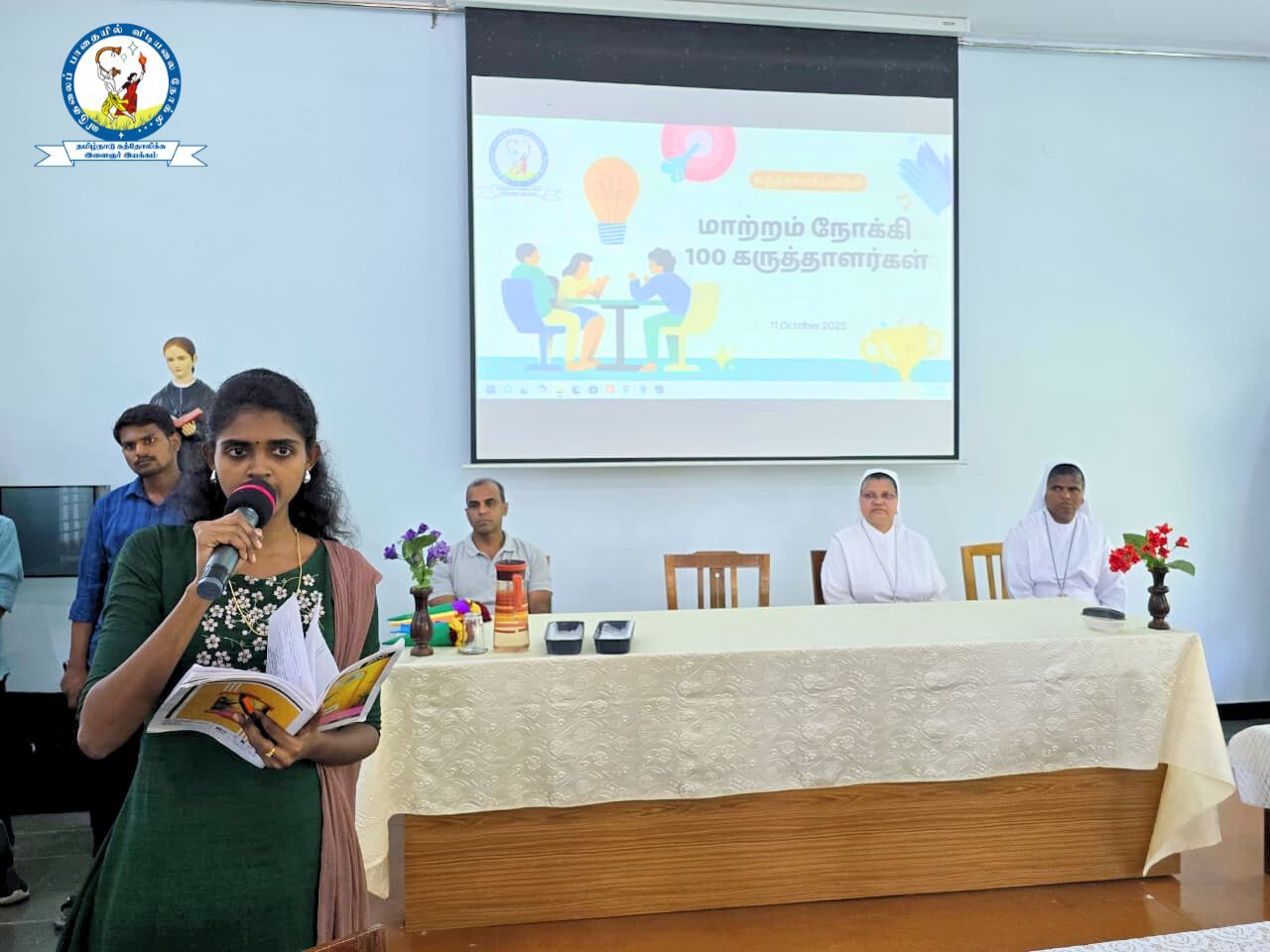 தமிழ்நாடு கத்தோலிக்க இளைஞர் இயக்கத்தின் முன்னெடுப்பான "மாற்றம் நோக்கி 100 கருத்தாளர்கள்" என்கிற, இளைஞர்களை கருத்தாளர்களாக உருவாக்கும் திட்டத்தின் இரண்டாவது நேரடி அமர்வு கடந்த சனி, ஞாயிறு ஆகிய கிழமைகளில் (அக்டோபர் 11,12) நடைபெற்றது. Sisters of Charity (SCCG) சபையின் தென்கிழக்கு இந்திய மாகாணத்தின் தலைமையகமான மரியகத்தில் நடைபெற்ற இந்த பயிற்சியில் தமிழ்நாட்டின் பல்வேறு பகுதிகளில் இருந்தும் 36 இளைஞர்கள் கலந்து கொண்டனர்.