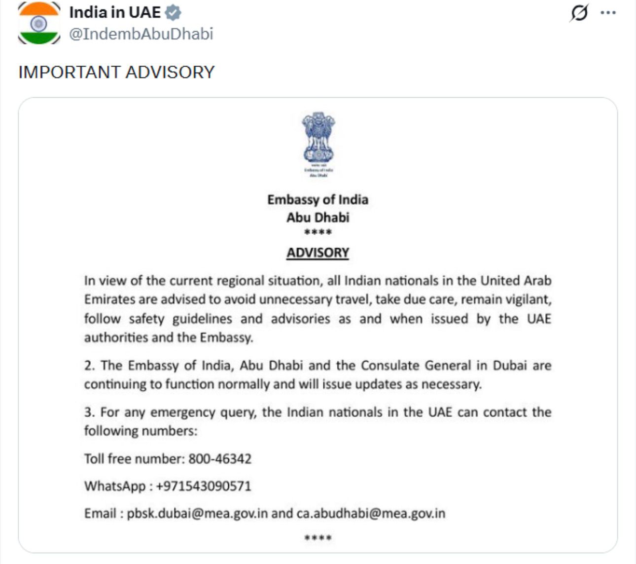 The Ministry of External Affairs (MEA), in coordination with Indian embassies and consulates, has issued advisories urging citizens to remain calm, stay updated through official channels, and maintain contact with local missions where necessary. The move is part of precautionary outreach efforts aimed at ensuring the safety and welfare of the Indian diaspora across the region.