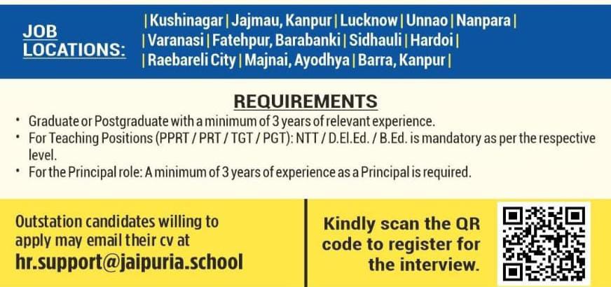 Outstation applicants may email their CVs to hr.support@jaipuria.school and candidates can also register by scanning the QR code provided in the official notice.
