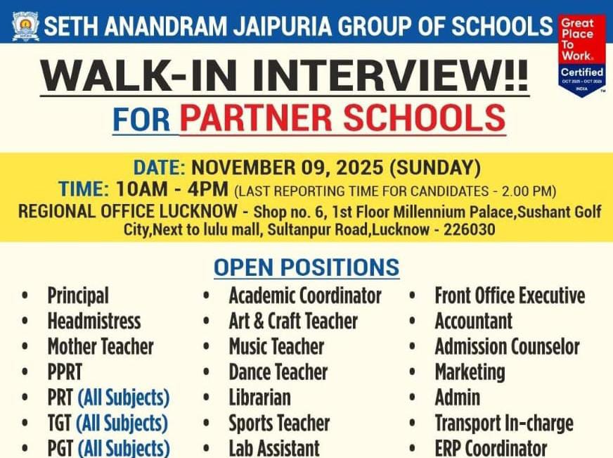 Lucknow, November 5, 2025: The Seth Anandram Jaipuria Group of Schools has announced a walk-in interview for multiple teaching and non-teaching positions across its partner schools.