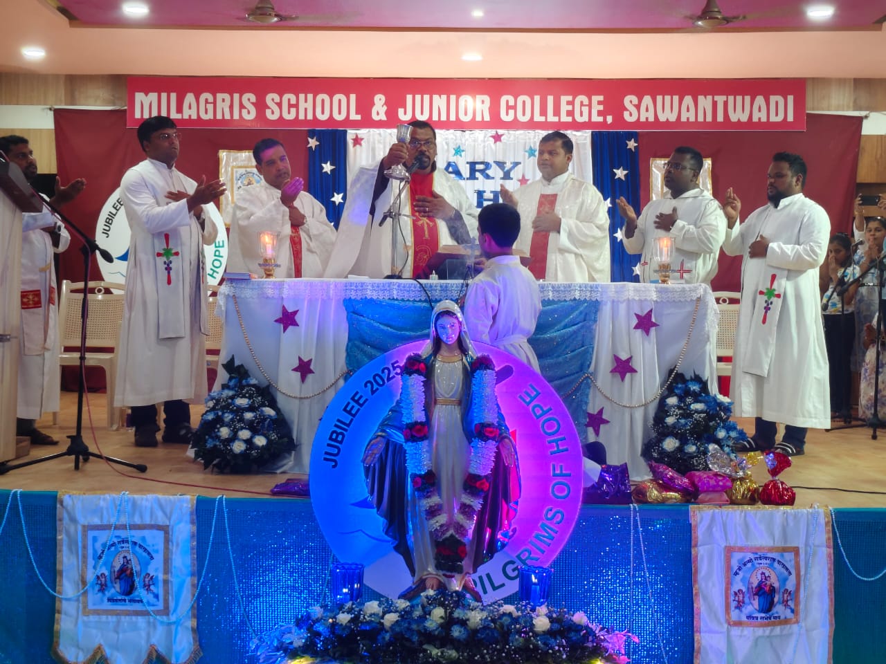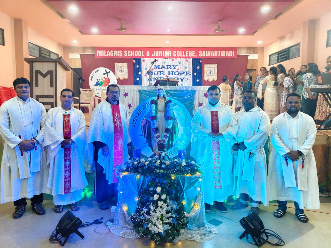 Sawantwadi, October 16, 2025: Milagris School and Jr. College in Sawantwadi, in the diocese of Sindhudurg recently marked Marian Night with great enthusiasm on 7th October, in the school auditorium. The event, themed “Mary, our hope and joy,” served as a heartfelt tribute to Mother Mary, drawing approximately 400 participants from diverse backgrounds.
