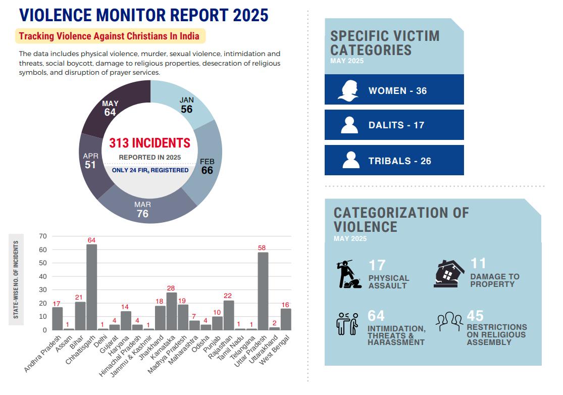 New Delhi, June 18, 2025: Violence against Christians in India has surged at an alarming rate, with 313 incidents reported between January and May 2025, according to data from the United Christian Forum (UCF) Helpline. The data reveals a disturbing upward trend: incidents have risen from 127 in 2014 to 834 in 2024. These figures show that, on average, more than two Christians are attacked every day in the country.