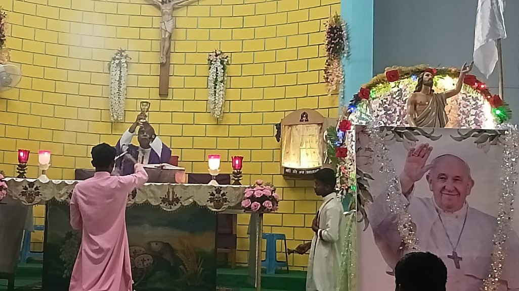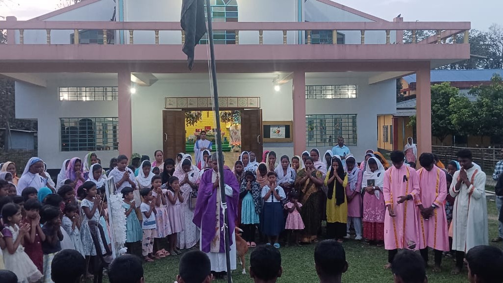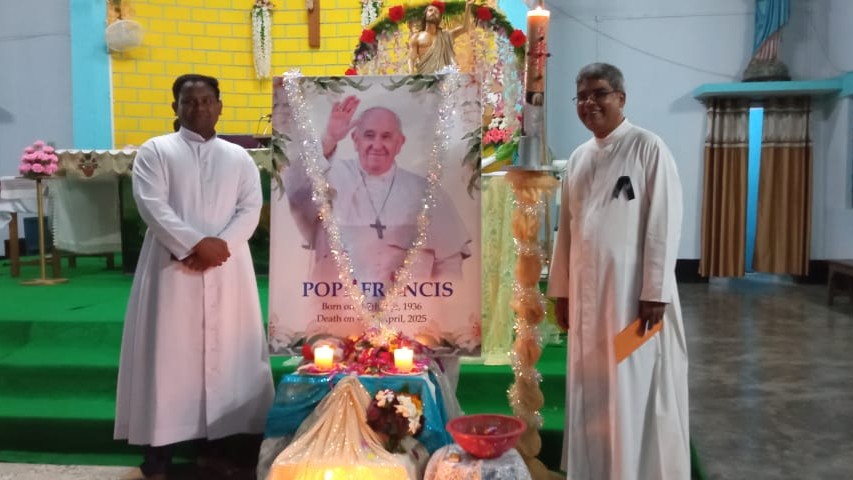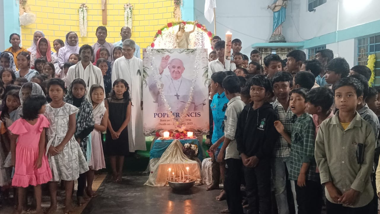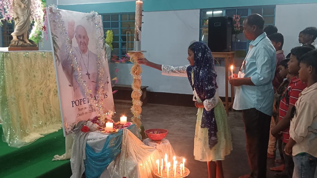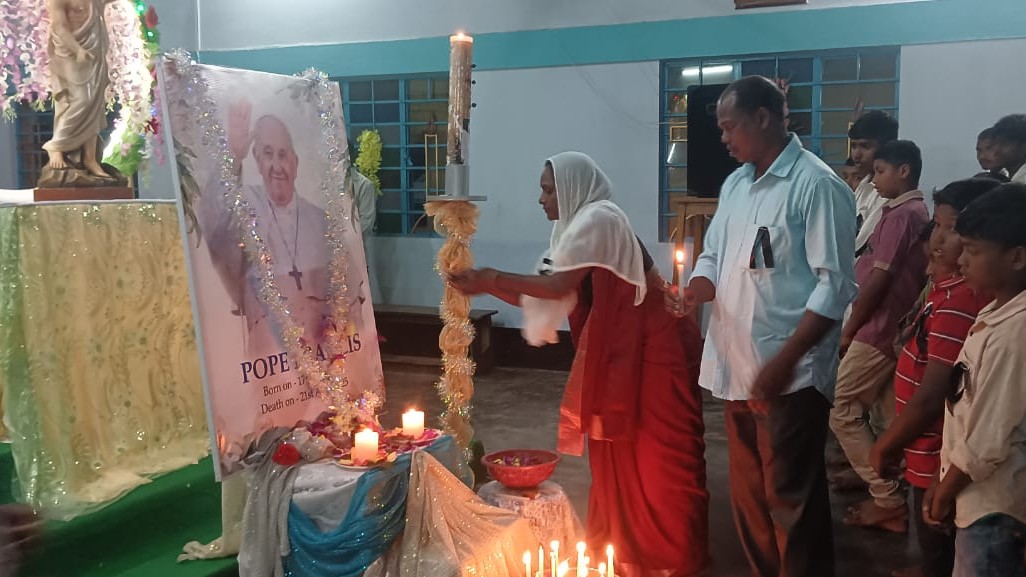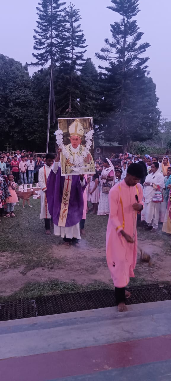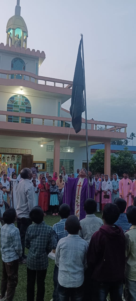 The event commenced after the evening rosary service, with the hoisting of a black flag in the church courtyard, symbolising mourning. Fr. Horo led the ceremony, after which the faithful observed a moment of silence. A procession, with Fr. Horo carrying a photograph of Pope Francis, then proceeded into the church. As the congregation entered in silence, Fr. Horo placed the image of the late Pope beside the altar, lit a candle, and offered a floral tribute. Later, parishioners followed, coming forward to pay their respects to the late pontiff.