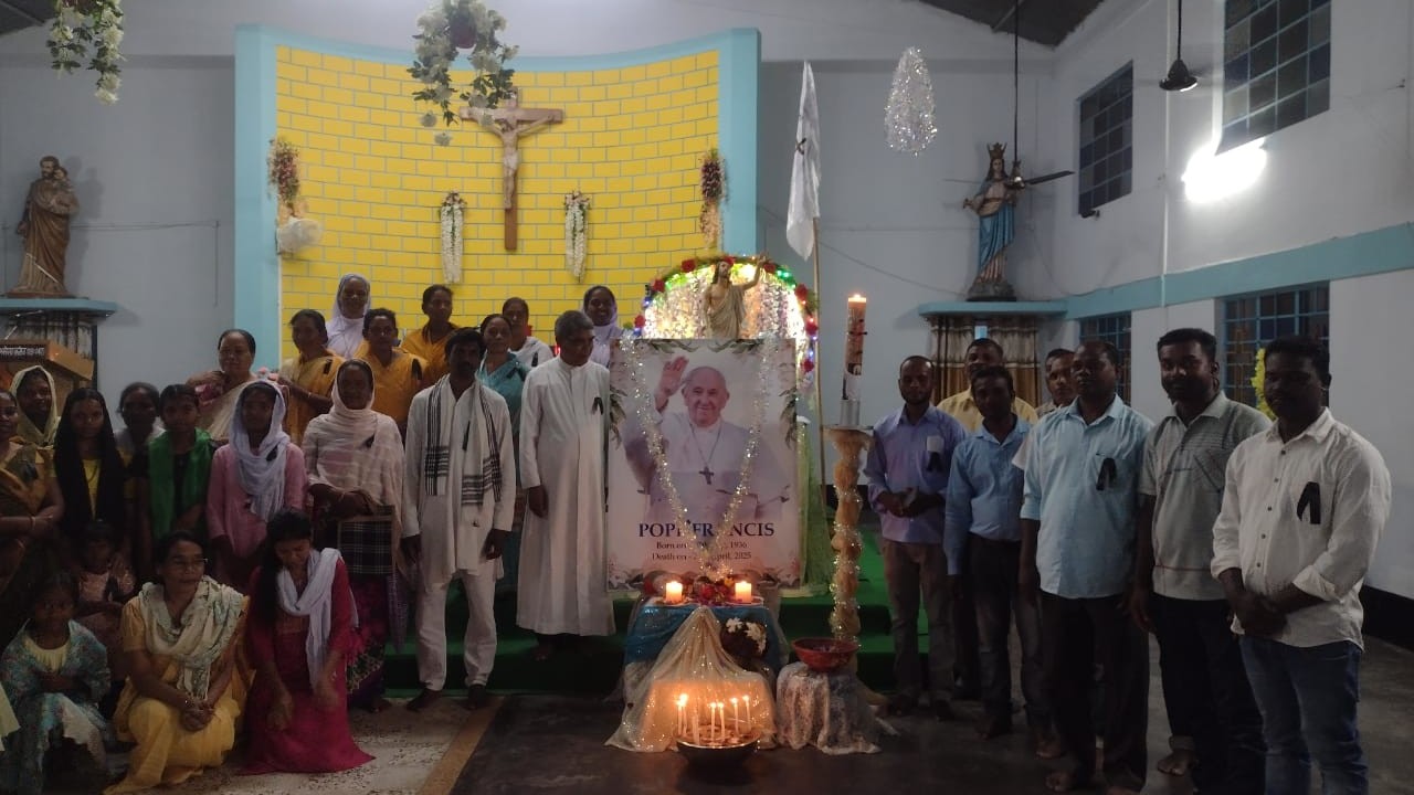 Dibrugarh, Assam, May 8, 2025: St. Dominic Savio Church in Tongana, Dibrugarh, hosted a solemn Requiem Mass on the evening of May 7, 2025, in honour of late Pope Francis. The service, led by Parish Priest Fr. William Horo, was attended by nearly 200 parishioners, with many wearing black badges on their chests as a sign of mourning.