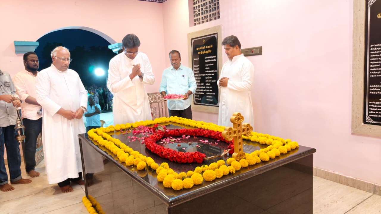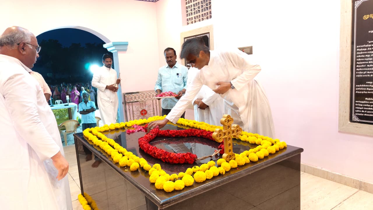 Fr. I. Arul SJ led prayers at the memorial, recalling the enduring love and gratitude of the faithful. Parish Priest Fr. M. R. Jesu, Fr. Sagayam, Assistant Parish Priest Fr. Francis Paul MIC, and Fr. Arockiasamy paid homage by garlanding the memorial and offering floral tributes.