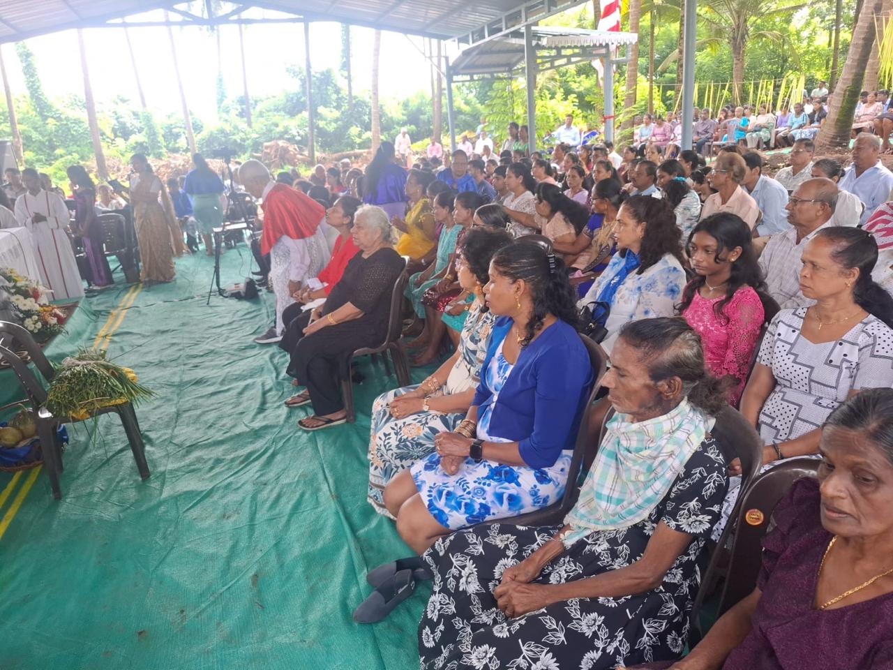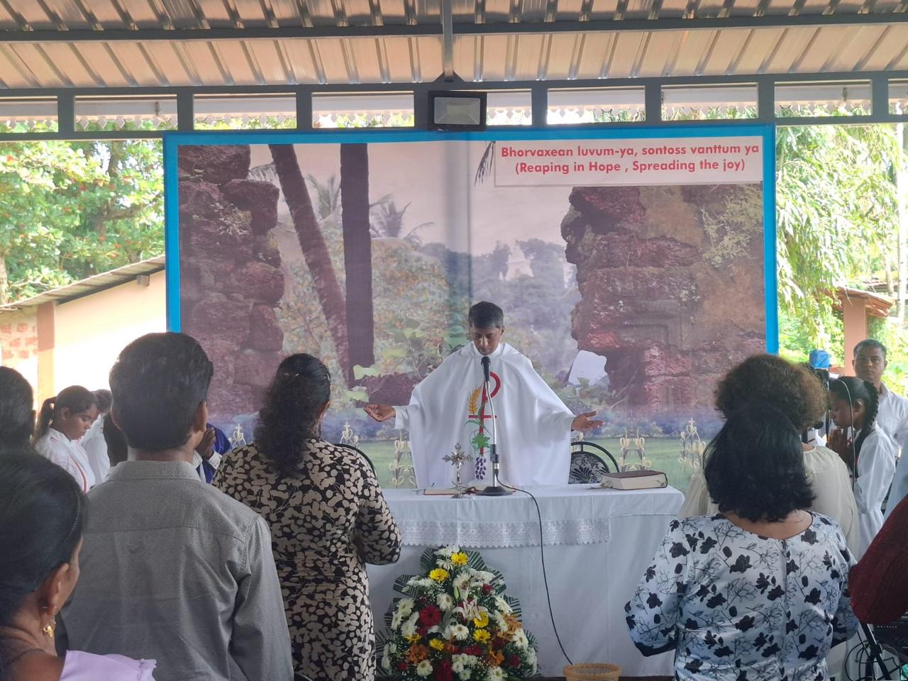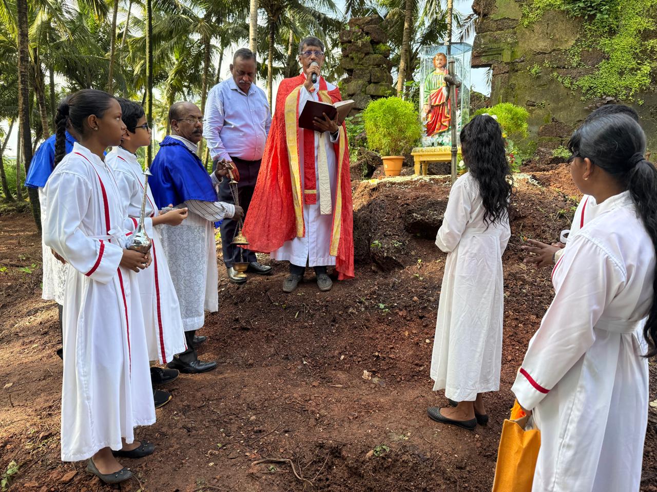 Fr. Bolmax blessed the fields and performed the traditional first paddy grain cutting (Konnos), a central act of the fest. The procession then continued to the ruins of the Old Church of St. Bartholomeu, where a new statue of St. Bartholomeu was permanently installed. For the first time in 278 years, public Mass was celebrated at the ruins, commemorating the parish’s 400-year journey of faith.