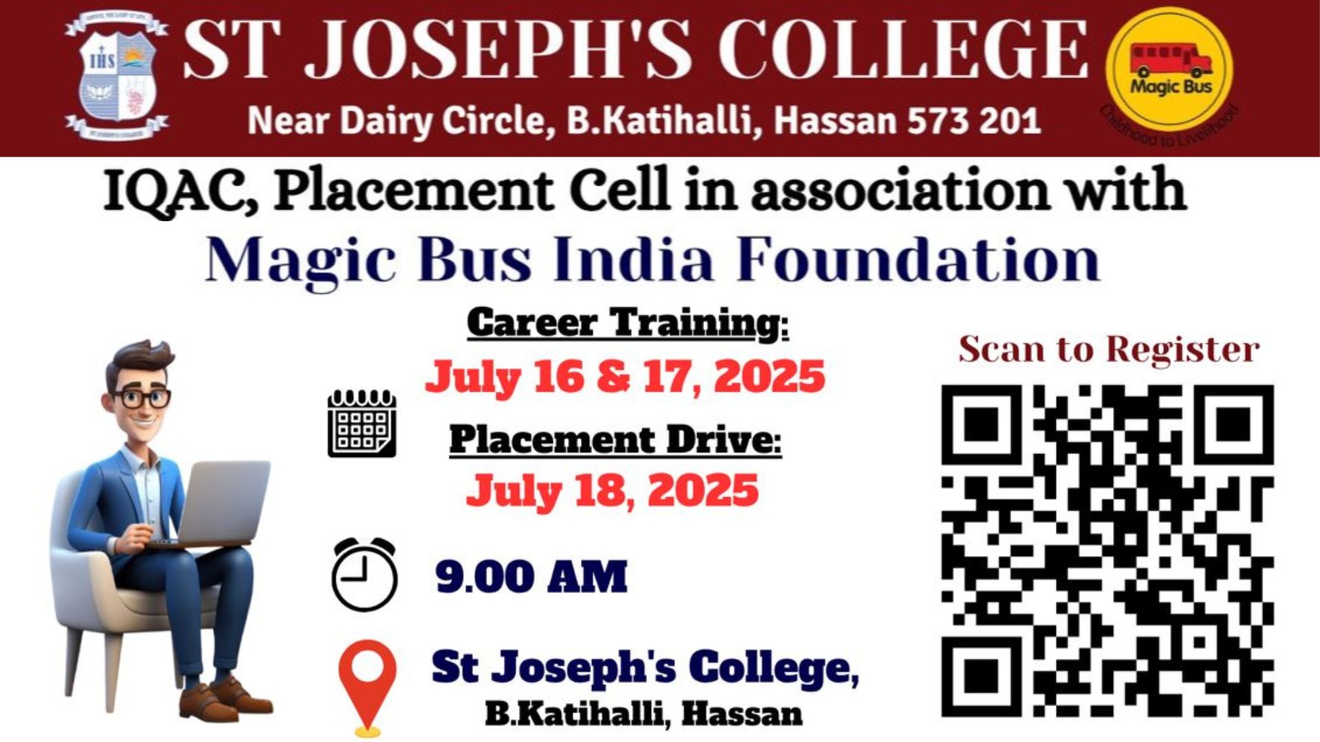 Hassan, Karnataka, July 12, 2025: St. Joseph’s College, Hassan, will be conducting a free Career Training Programme and Job Placement Drive from July 16 to 18, 2025, at its campus in B. Katihalli, a village in Hassan district. The event is aimed at undergraduate, postgraduate, diploma, and ITI students from Hassan and surrounding areas and is being held in collaboration with the Magic Bus India Foundation. Interested candidates must register online in advance to secure their participation in the event.