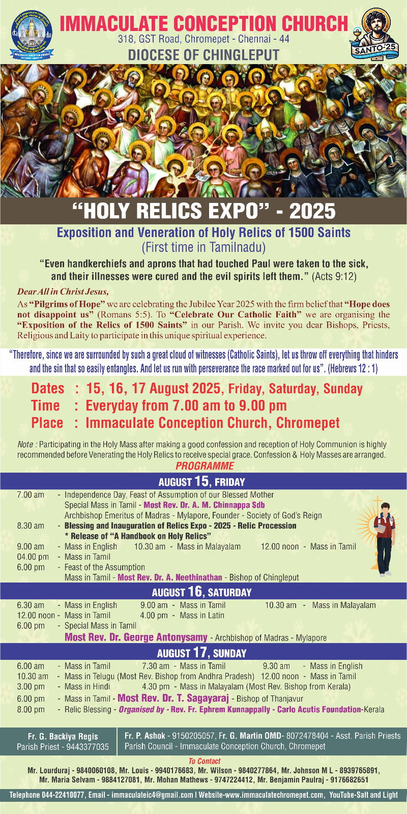 The event opens on Friday, 15 August — coinciding with India’s Independence Day and the Feast of the Assumption of the Blessed Virgin Mary — with a special Tamil Mass celebrated by Most Rev. Dr. A. M. Chinnappa SDB, Archbishop Emeritus of Madras-Mylapore. The official inauguration and relic procession will follow at 8:30 a.m., along with the release of A Handbook on Holy Relics.