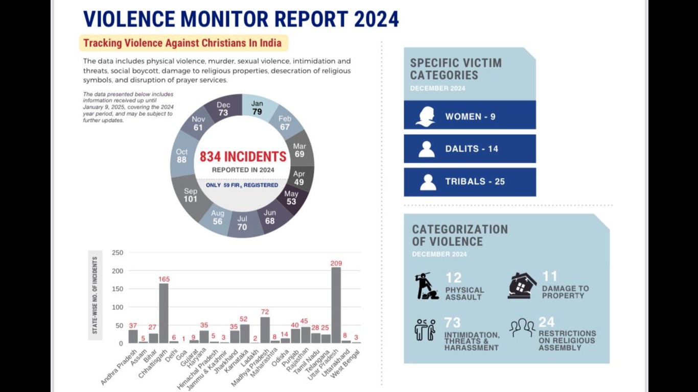 New Delhi, January 10, 2025: A disturbing surge in violence against Christians has been recorded in India, with 2024 witnessing 834 incidents over 366 days. This marks a significant rise of 100 incidents compared to the 734 attacks reported in 2023. Data from the United Christian Forum (UCF) Helpline highlights that more than two Christians were targeted daily last year, solely for practicing their faith.