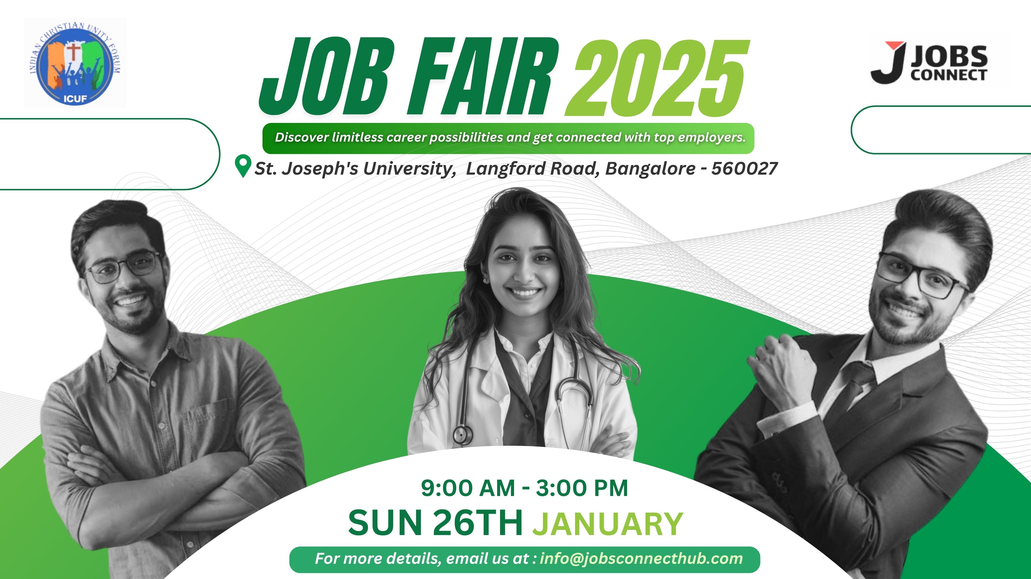Bengaluru, January 24, 2025: Jobs Connect , an initiative of the Conference of Catholic Bishops of India (CCBI), is thrilled to announce the highly anticipated Job Fair 2025 in collaboration with St. Joseph’s University. The event will take place on Republic Day, January 26, 2025, from 9:00 AM to 3:00 PM, at St. Joseph’s University, Langford Road, Bengaluru.
