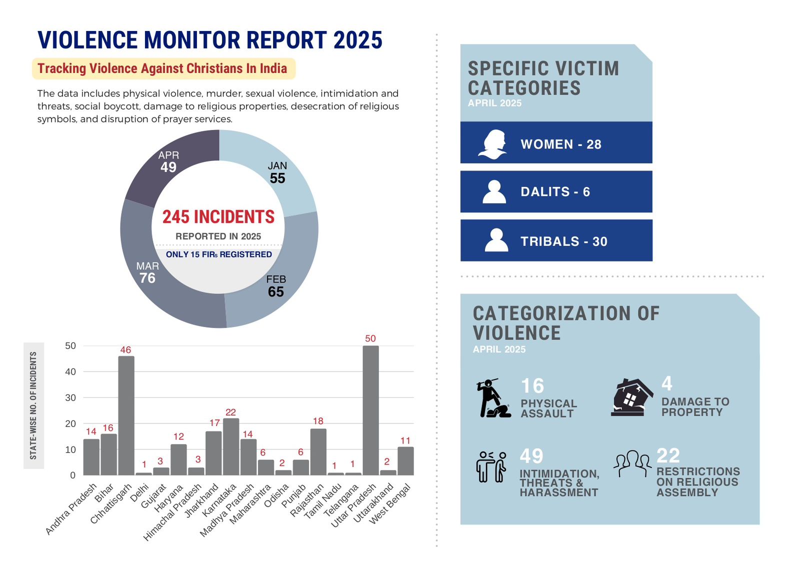 New Delhi, 16 May 2025: Between January and April 2025, 245 incidents of violence against Christians were reported from 19 states across India, according to data compiled by the United Christian Forum (UCF) through its toll-free helpline 1-800-208-4545. The surge reflects a sustained rise in communal hostility in the country.