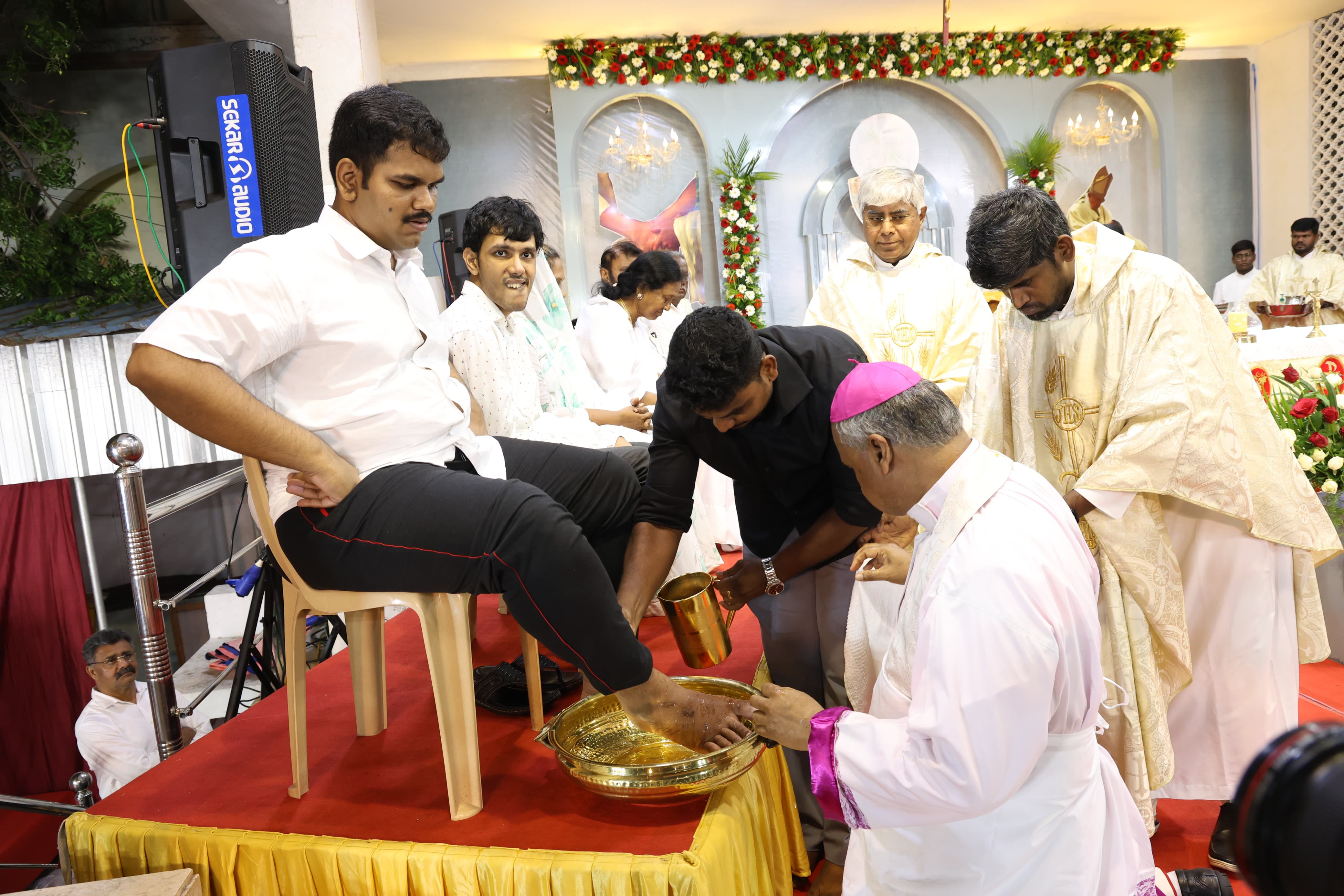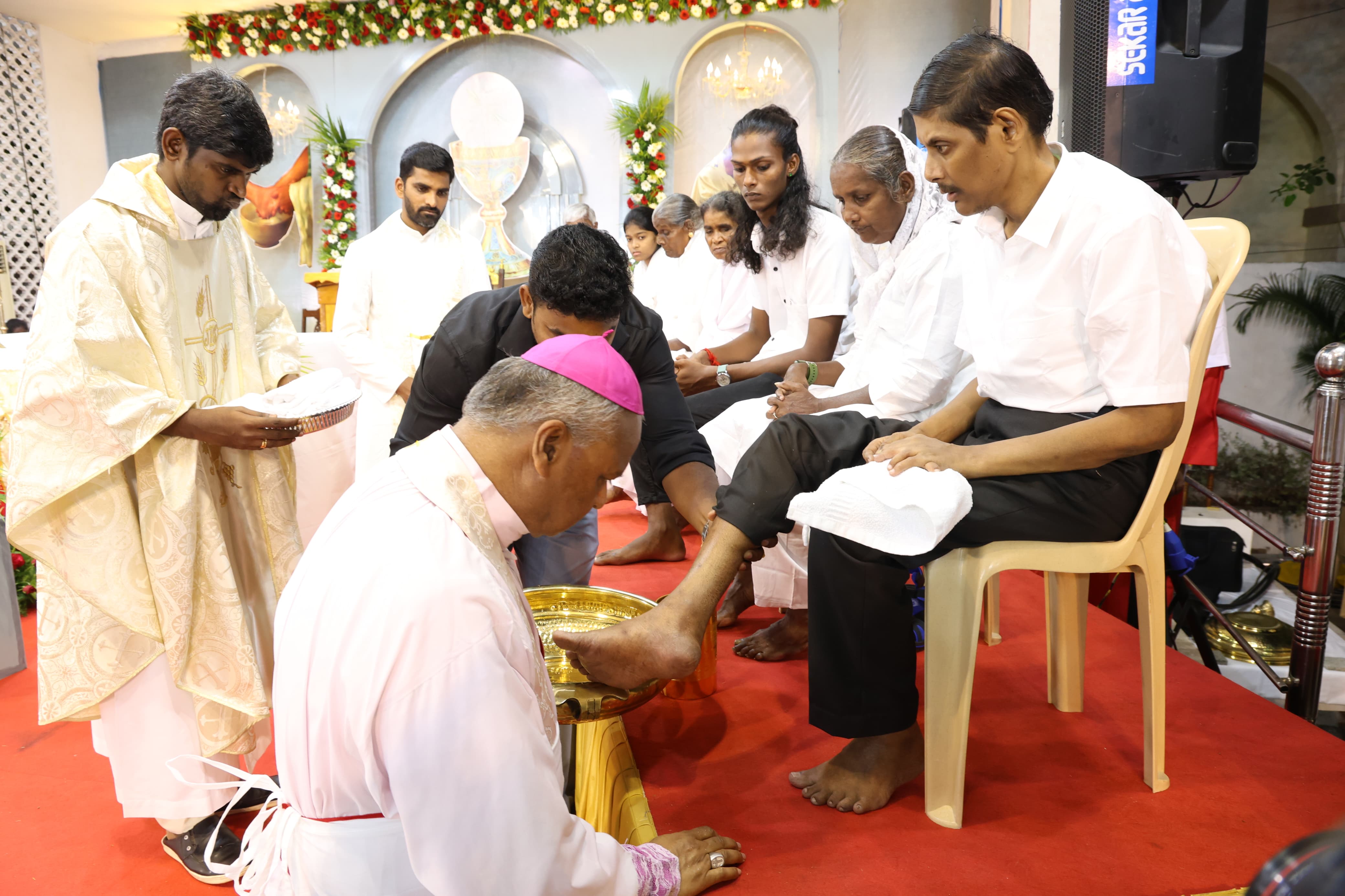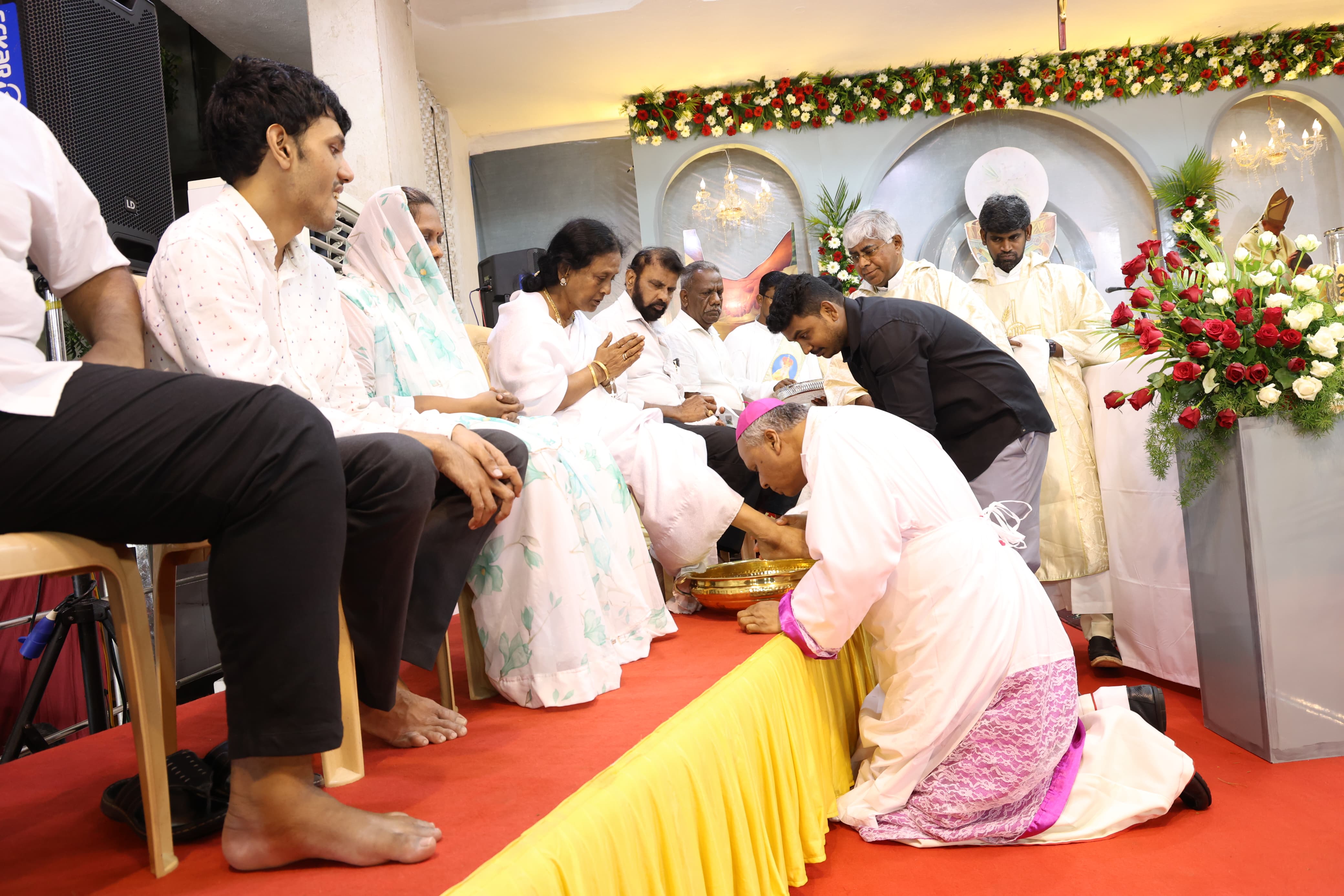 Departing from the traditional practice of washing the feet of twelve men, the Archbishop washed the feet of a diverse group: three persons with mental challenges, two with physical challenges, one visually challenged individual, two women, two men, a 12-year-old child who lost his mother this year, and a member of the third gender.