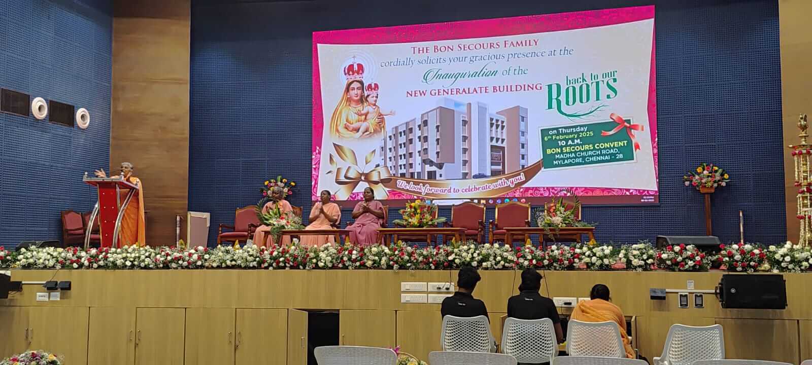 Key facilities, including the Archives Room, Conference Hall, and Auditorium, were blessed and opened by esteemed guests such as Rev. Fr. Vincent Chinnadurai (Parish Priest, Santhome Cathedral), Rev. Fr. C. Joe Arun S.J. (Chairman, State Minorities Commission, Tamil Nadu), and Rev. Fr. Dr. Xavier Arul Raj (Senior Advocate, High Court of Madras). The auditorium was formally inaugurated by Mother M. Arockiam FSJ, Superior General of the Franciscan Sisters of St. Joseph.
