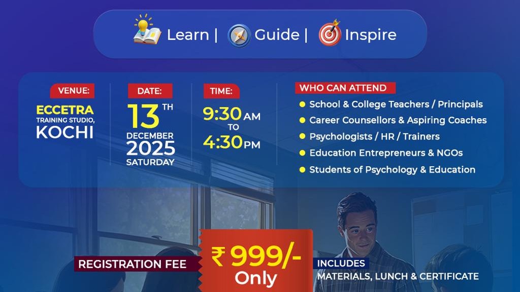 Kochi, 29 November, 2025: Eccetra has announced a one-day Workshop on Career Coaching, designed to empower participants to become coaches who help shape the futures of young learners and professionals. The event will take place on 13 December 2025 at the Eccetra Training Studio in Kochi, offering a full day of learning from 9:30 a.m. to 4:30 p.m.