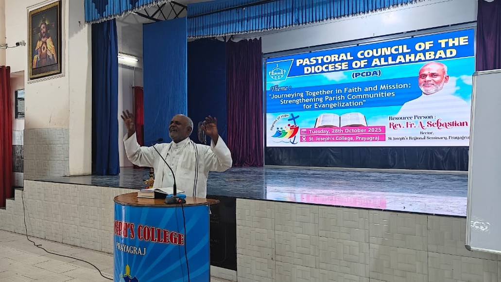 Prayagraj, October 28, 2025 — The Pastoral Council of the Diocese of Allahabad (PCDA) gathered at St. Joseph’s College, Prayagraj in Allahabad for a diocesan-level assembly focused on strengthening parish communities for mission and evangelization. The event, attended by around 145 clergy, religious and lay faithful, was held under the theme “Journeying Together in Faith and Mission: Strengthening Parish Communities for Evangelization.”