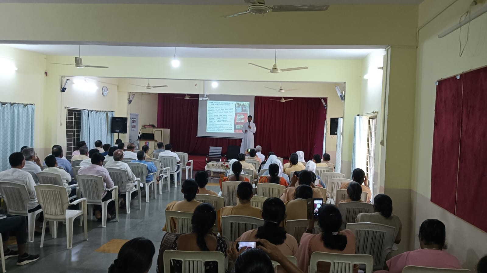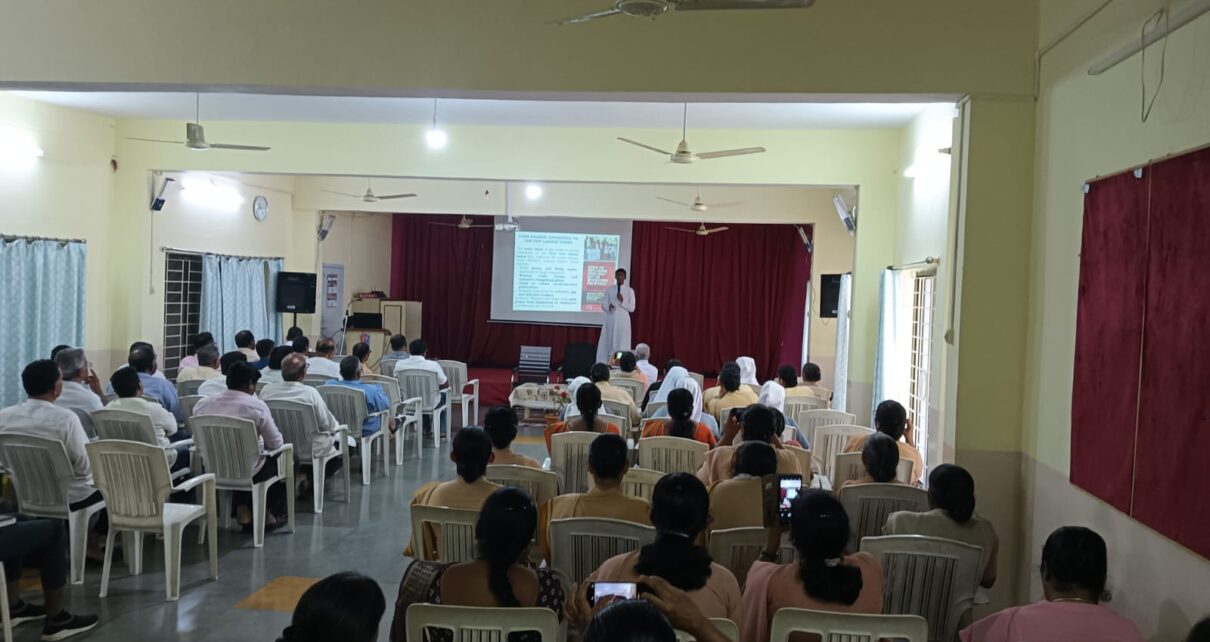 Adv. Fr. Vincent Pereira, Advocate of the Diocese of Gulbarga, served as the resource person and delivered a detailed and practical presentation on the four New Labour Codes and related regulations. He outlined key changes concerning wages, Employees’ State Insurance (ESI), Provident Fund (PF), gratuity, professional tax, leave policies, statutory registers, registration procedures, social security provisions, and occupational safety and health standards.