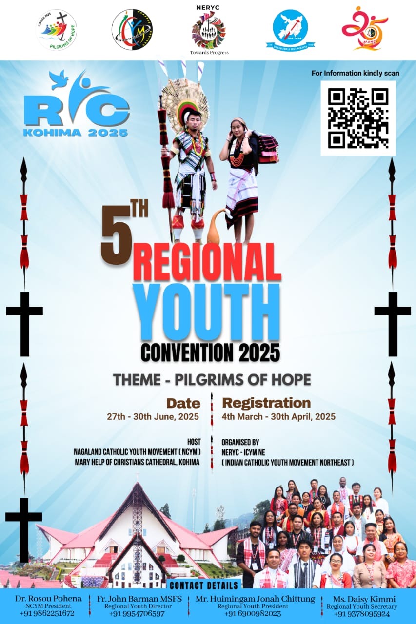 Kohima, June 25, 2025: The Nagaland Catholic Youth Movement (NCYM) is set to host the 5th Regional Youth Convention (RYC) from June 27 to 30, 2025 at the Mary Help of Christians Cathedral, Kohima. The event, themed “Pilgrims of Hope”, is expected to draw over 2,000 delegates from across the 15 dioceses of the region.