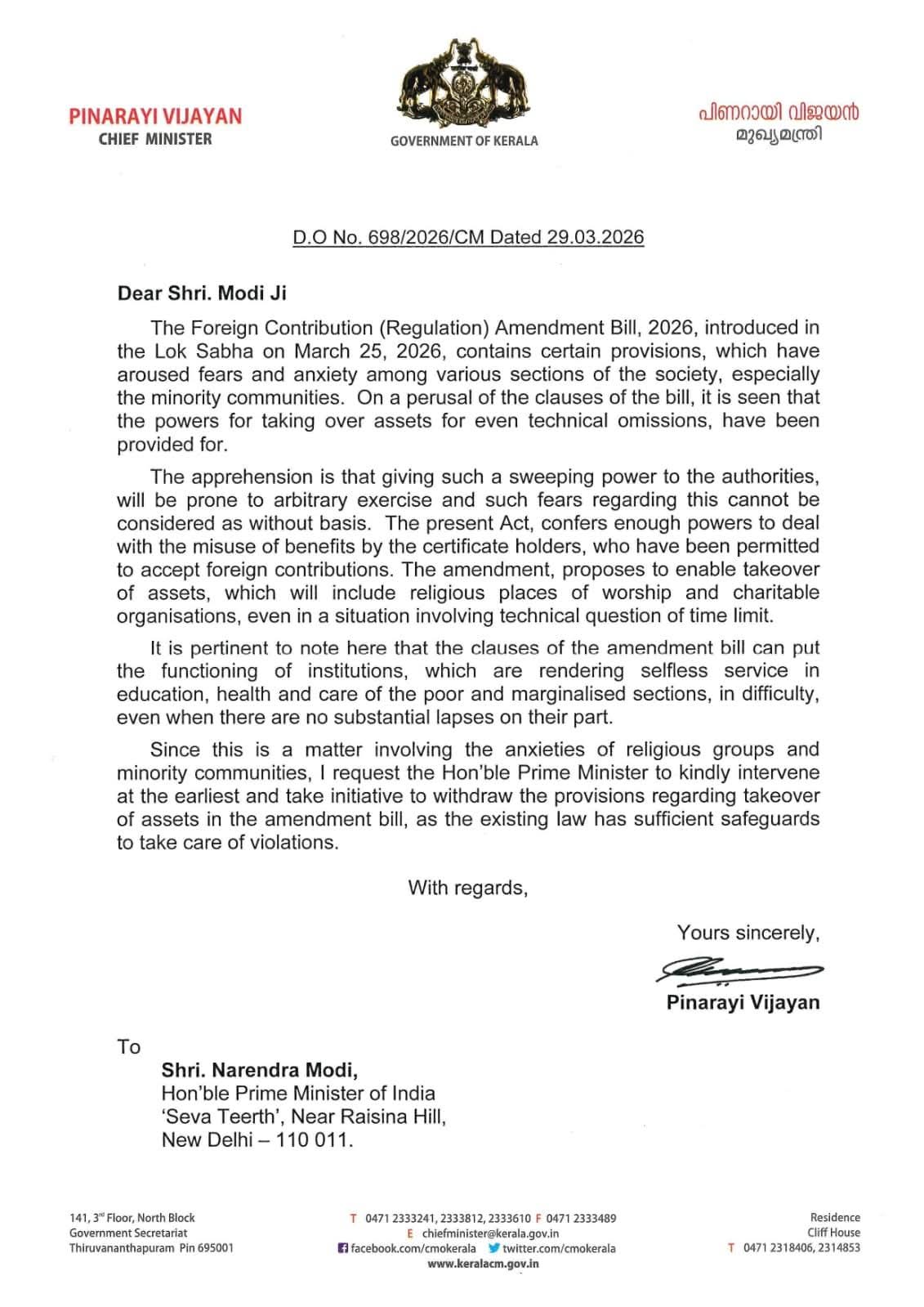 திருவனந்தபுரம், மார்ச் 31, 2026: வெளிநாட்டுப் பங்களிப்பு (முறைப்படுத்துதல்) திருத்த மசோதா, 2026-ல் உள்ள சில விதிகள் குறித்துப் பலத்த கவலைகளைத் தெரிவித்துள்ள கேரள முதல்வர் பினராயி விஜயன் மற்றும் எதிர்க்கட்சித் தலைவர் வி.டி.சதீசன் ஆகியோர், சிறுபான்மையினரிடையே வளர்ந்து வரும் அச்சத்தைக் கருத்தில் கொண்டு இவ்விவகாரத்தில் தலையிடுமாறு பிரதமர் நரேந்திர மோடிக்குக் கடிதம் எழுதியுள்ளனர்.