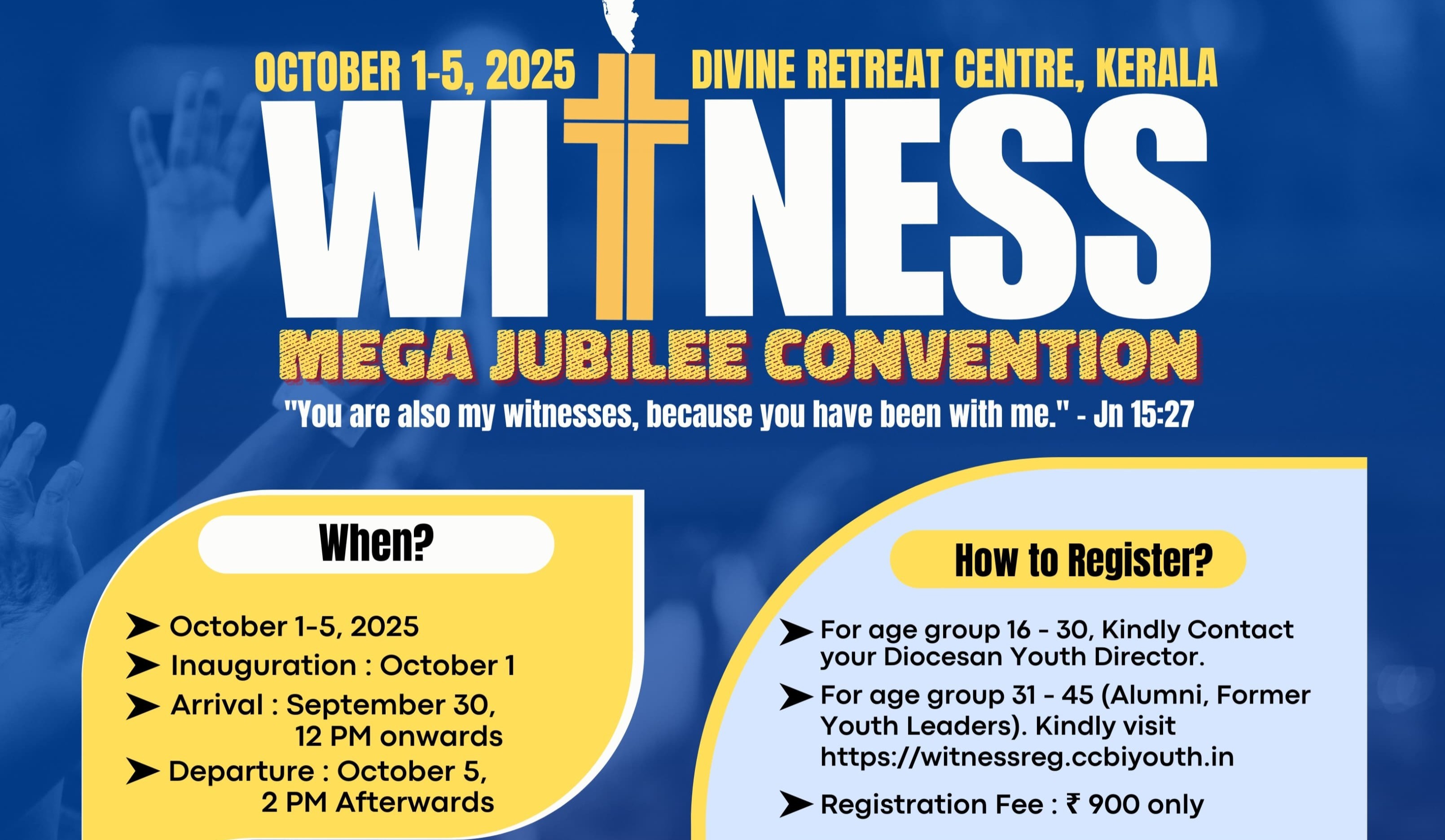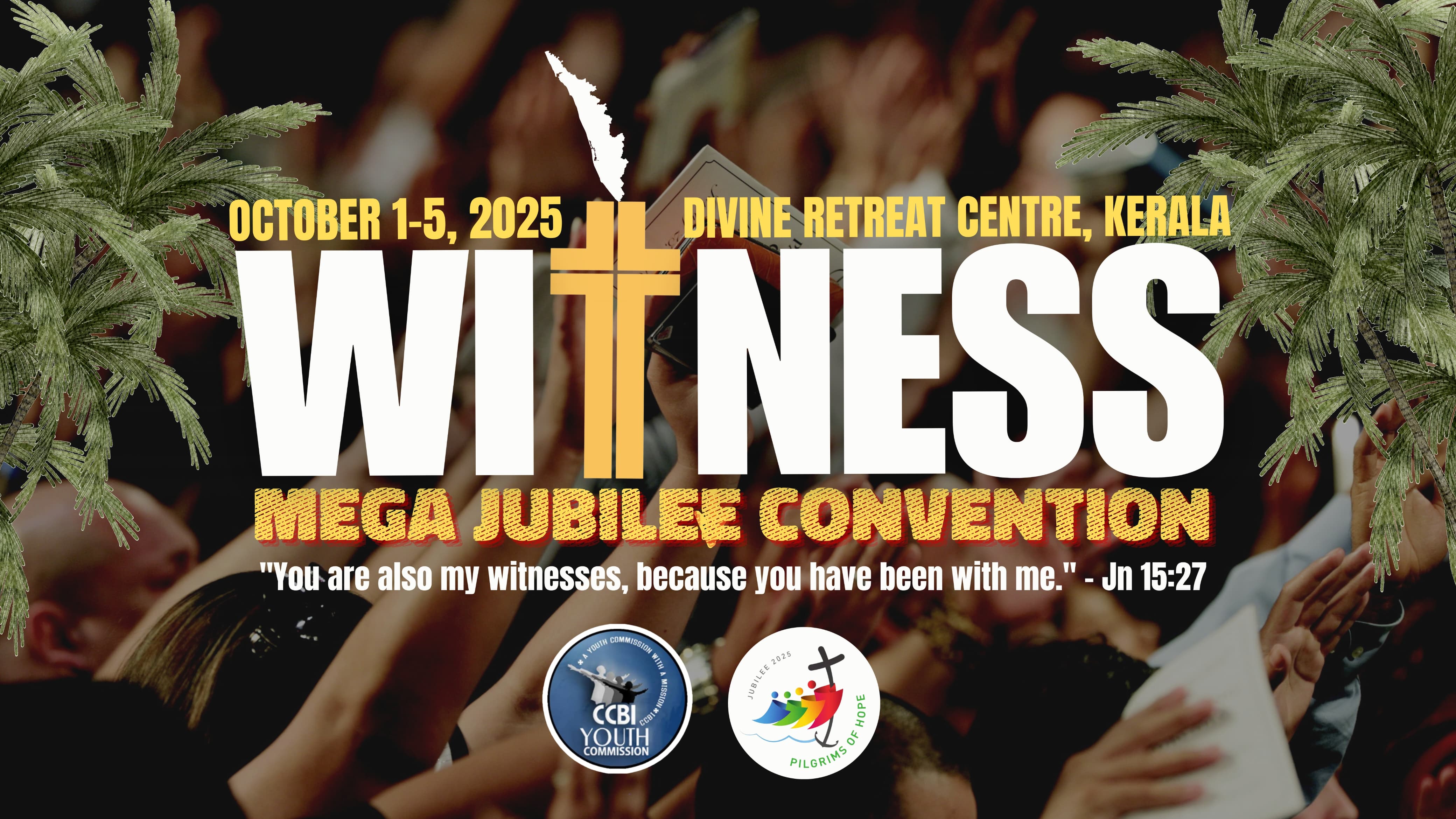 Delhi, May 20, 2025: The Indian Catholic Youth Movement, under the aegis of the CCBI Youth Commission, is set to host "Witness 2025" – The Mega Jubilee Convention at the Divine Retreat Centre in Kerala. Scheduled from October 1 to 5, 2025, this national event aims to bring together thousands of young Catholics from across India under the powerful theme “You are also my witnesses, because you have been with me” (John 15:27).