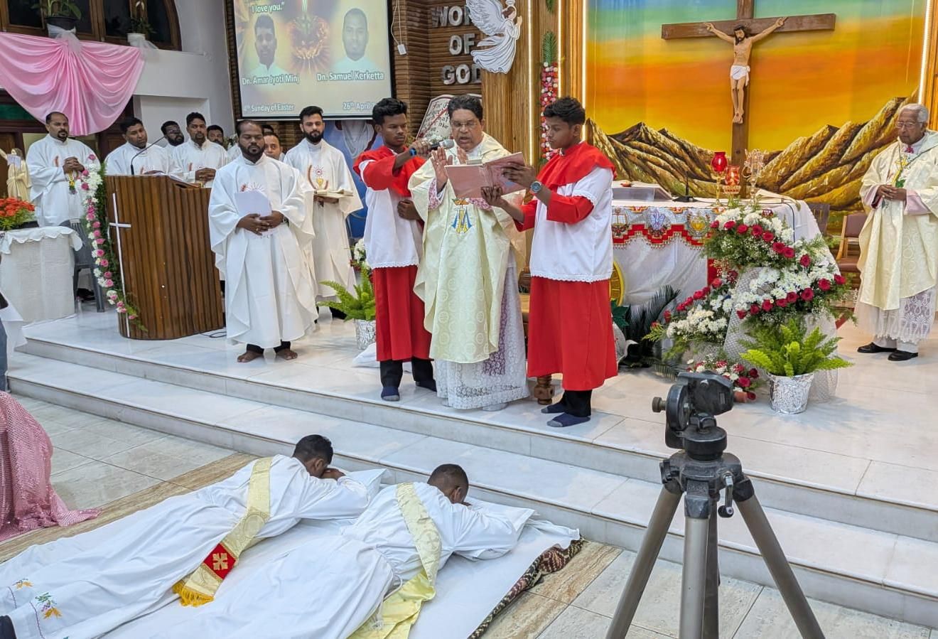 Bishop Joseph Kallarackal of Jaipur presided over the sacred rite of ordination of Fr. Amar Jyoti Minj and Fr. Samuel Kerketta in the presence of a large gathering of priests, religious, family members, and faithful from across the diocese.