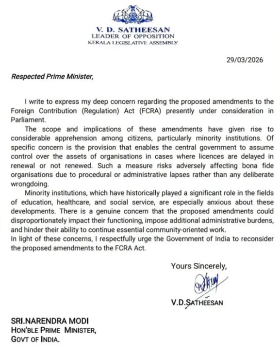 Thiruvananthapuram, March 29, 2026: V. D. Satheesan has expressed serious concerns over the proposed amendments to the Foreign Contribution (Regulation) Act, urging the Union Government to review the provisions in light of growing apprehensions among minority institutions.