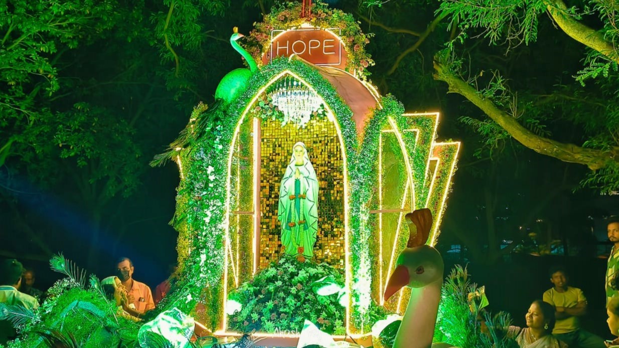 The celebrations began with morning Masses at 7:00 a.m., 8:15 a.m., and 9:30 a.m. The highlight of the day was the Thanksgiving Mass at St. Theresa’s Novitiate in the evening. The Mass was followed by the blessing of the decorated Mother Mary’s Chariot, leading to a grand procession towards the church.