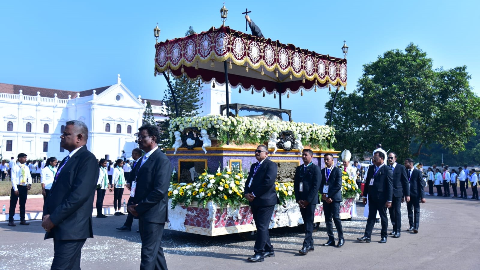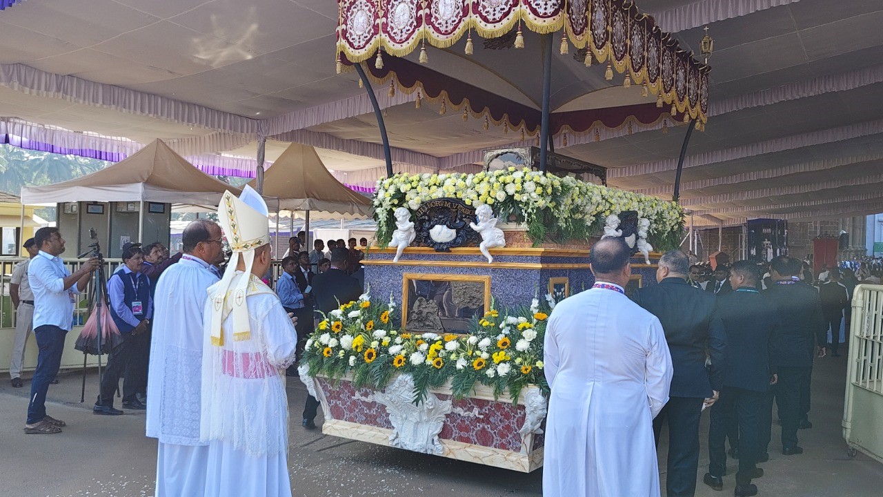Bishop Simião Fernandes led the Morning Prayer (Prayer of the Church) at the Se Cathedral before the procession began. A diverse group of representatives participated in the procession, including volunteers, security personnel, police, firefighters, medical and ambulance staff, ASI staff and officials, buggy services, water supply teams, e-rickshaw drivers, laundry staff, caterers, Wellfit tailors, meal suppliers for the canteen, the electricity department, R.K. cleaning agency, and Pilgrim village volunteers. Officials from various government departments, along with youth, priests, religious, and seminarians, also took part. Fr. Henry Falcão, Convenor of the Exposition, handed over the casket containing the relics to the administrative committee of the Basilica.
