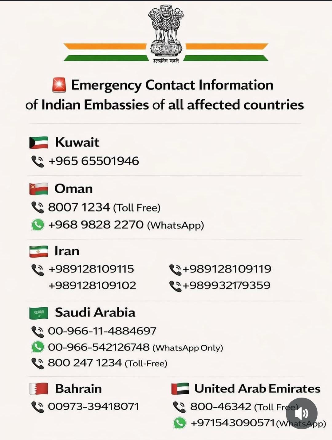 புது தில்லி: மார்ச் 1, 2026: பிப்ரவரி 28, 2026 அன்று வளைகுடா மற்றும் மத்திய கிழக்கு பகுதியில் அதிகரித்து வரும் பதட்டங்களைக் கருத்தில் கொண்டு பாதிக்கப்பட்ட நாடுகளில் வசிக்கும் அல்லது பயணம் செய்யும் இந்திய குடிமக்களுக்கு உதவ, இந்திய அரசு தனது தூதரகங்கள் மூலம் பிரத்யேக அவசர உதவி எண்களை அறிமுகப்படுத்தியுள்ளது. இந்திய தூதரகங்களுடன் இணைந்து வெளியுறவு அமைச்சகம் (MEA) வெளியிட்டுள்ள செய்திக்குறிப்பில், குடிமக்கள் அமைதியாக இருக்குமாறும், அதிகாரப்பூர்வ ஊடகங்களகன் மூலம் உடனுக்குடன் தகவல்களைப் பெறுமாறும், தேவைப்படும் இடங்களில் உள்ளூர் தூதரகங்களை தொடர்பு கொள்ளுமாறும் வலியுறுத்தியுள்ளது.